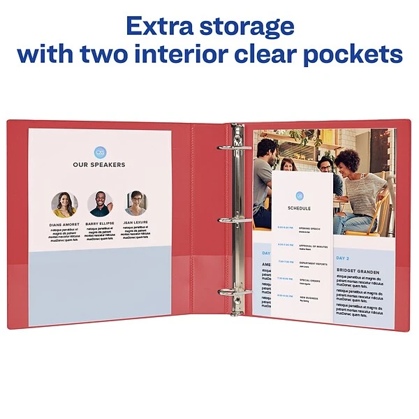 DuraHinge design is stronger, lasts longer and resists tearing. DuraEdge feature makes the sides and top more pliable to resist splitting. Wider front and back binder panels fully cover standard dividers and sheet protectors. Organize and secure paper with two interior pockets. Slant rings have a higher page capacity compared to same size round rings. Pages lie flat with back mounted rings. Black vinyl on inside front and back covers (except red). Exposed rivets on back. Holds 8-1/2″ x 11″ documents. 39% minimum post-consumer content.