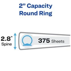 Use This Avery 2-inch round ring binder holds up to 375 standard letter-size pages and offers an easy solution for files that need to be stored and organized. Back-mounted rings offer additional durability, and they open and close easily when it’s time to add, remove or reorder the pages inside. Quick access to two interior pockets makes tucking away handouts, unpunched paperwork and pamphlets easier. The Avery 375-sheet view binder includes customizable front and back overlays that hold custom title pages, as well as a spine pocket that displays identifying labels.