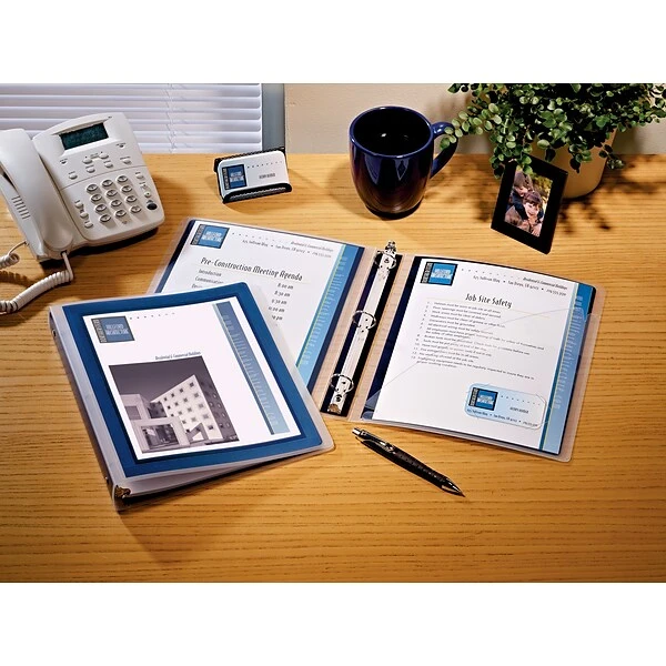 Walk confidently into any presentation with Avery’s flexible poly binder. The front cover’s graphic border ensures a professional look. The binder’s nonstick surface prevents ink from lifting off inserts, preserving color, graphics and text. Slip a custom printout into the cover and spine for a final, polished touch. It’s the small, simple details that distinguish the Avery Flexi-View presentation binder with 1.5-inch round rings from the rest.