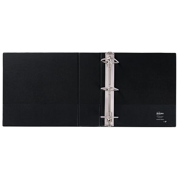 DuraHinge design is stronger, lasts longer and resists tearing. DuraEdge feature makes the sides and top more pliable to resist splitting. Wider front and back binder panels fully cover standard dividers and sheet protectors. Organize and secure paper with two interior pockets. Slant rings have a higher page capacity compared to same size round rings. Pages lie flat with back mounted rings. Black vinyl on inside front and back covers (except red). Exposed rivets on back. Holds 8-1/2″ x 11″ documents. 39% minimum post-consumer content.