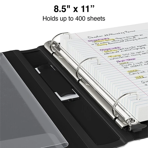 Manage notes, paperwork, projects or reference material with this Staples Better view binder. The clear overlay on the front cover lets you create a custom title page, and slant-D rings hold up to 400 sheets and open or close with a single touch to easily insert or rearrange papers. The rubberized edges and spine of this Staples Better view binder are flexible and resist splitting or tearing to withstand frequent use.