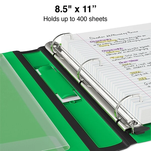Keep notes, study guides and other papers all in one place with this green view binder. The interior features easy-open rings that let you open and shut them with a single touch, while the clear spine label inserts let you customize the look and title information. This Staples Better view binder can hold up to 400 sheets of paper to meet large storage needs.