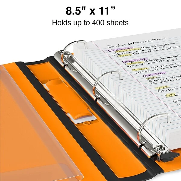 Get easy access to important documents with this Staples Better orange three-ring view binder. The special locking mechanism design lets you open and close the rings with one touch, making it easy to insert and withdraw pages. This Staples Better orange three-ring view binder has a reinforced rubberized spine for long-lasting durability and holds up to 350 letter-sized sheets of paper.