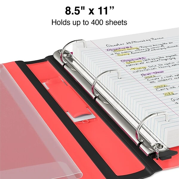 Archive documents for the long-term with this pink view binder. The 1.5-inch D rings can hold up to 400 letter-sized pages and open with a single touch, while the flexible spine design resists splitting. This Staples Better D three-ring view binder has a slot on the spine for easy insertion of custom labels, so you can identify binder contents at a glance.