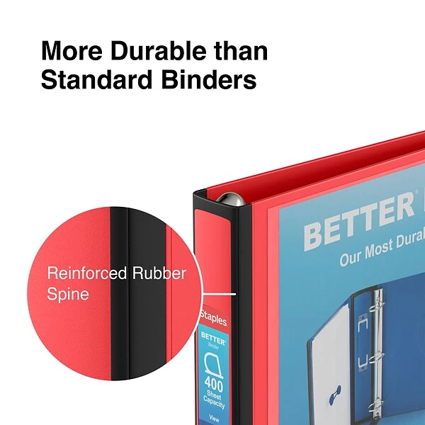 This Staples Better view binder with 1.5-inch D-rings efficiently holds up to 400 pages to meet the moderate organizational demands of businesses and home offices. Quickly add or remove pages with the easy-open rings, which operate with the touch of a finger to increase productivity. Immediately identify the binder’s contents without the need to remove it from a shelf thanks to the spine label holder.