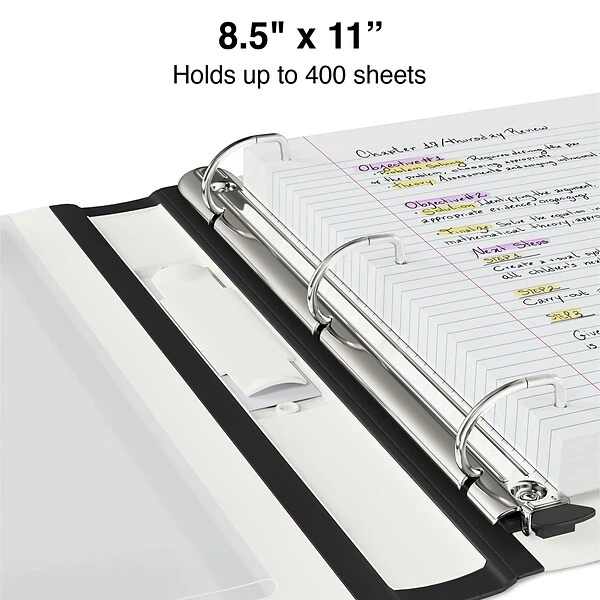 Keep important paperwork in one central location with this Staples Better view binder. The durable D-rings feature a one-touch opening mechanism, providing convenient access to stored documents. A clear overlay and handy spine insert make it easy to label this Staples Better view binder by subject or client name, while the nonstick, archive-safe material prevents ink and toner from lifting off the page.