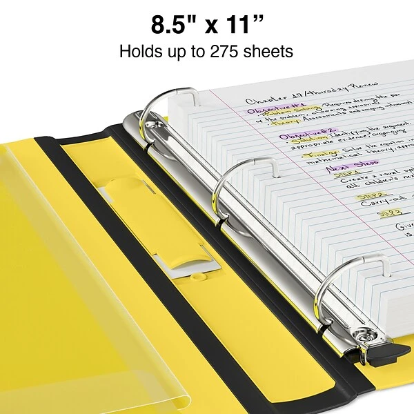 With this Staples Better view binder, 1-inch D-rings hold 25 percent more than the traditional rings. The binder can accommodate up to 275 sheets of standard 8.5 x 11 inch paper, and the one-touch opening mechanism prevents ensures there are no gaps in the rings that can rip or tear pages. The binder’s rubberized edges and spine flex under pressure instead of ripping, which helps protect the rings from misalignment, damage or becoming bent.