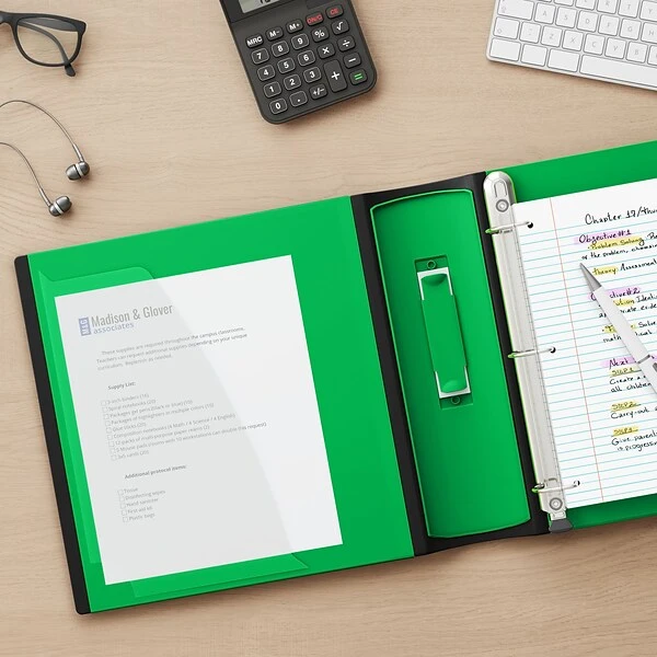 Keep your papers safe and accessible with this green Staples Better view binder. The 2-inch rings lock in place to keep pages secure, while the gap-free design prevents them from misalignment. Four pockets line the interior, allowing for extra storage and quick access to your documents. Each Staples Better view binder holds up to 540 sheets and is manufactured with nonstick, archival-safe polypropylene that stands up to daily use.