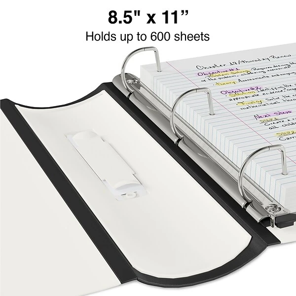 This Staples Better view binder features 3-inch D-rings that hold up to 600 sheets of 8.5 x 11 inch paper. A clear front overlay lets you insert a custom title page for a more professional appearance, and a label holder on the spine holds identifying labels from the inside to ensure that they stay secure. Two interior pockets are the perfect place to tuck away meeting agendas, class schedules or other essential loose items.