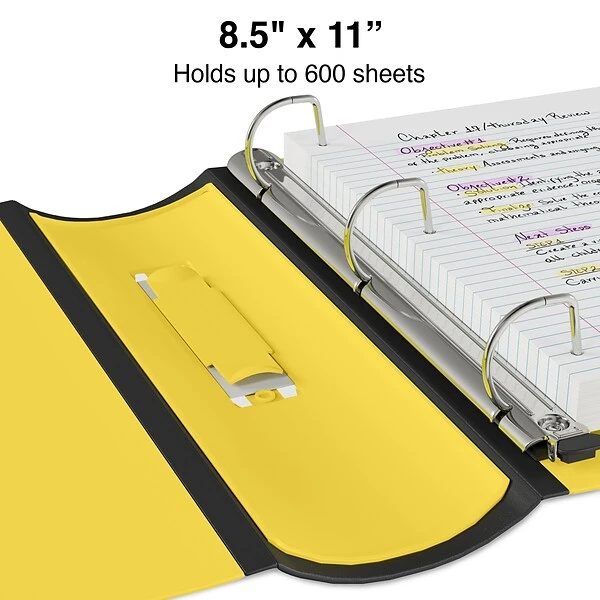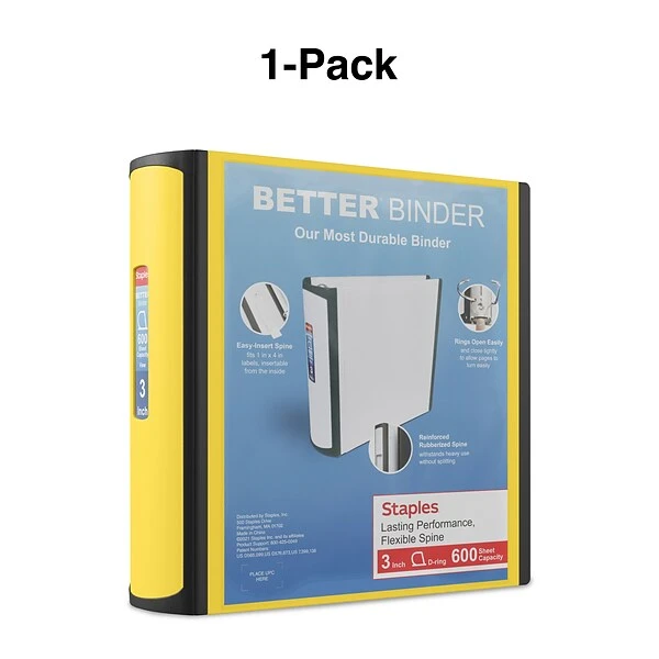Enjoy the high-quality look and feel of this Staples Better three-ring yellow view binder. The spine and edges are reinforced to keep your documents safe, while additional interior pockets provide extra storage space for any loose papers. This Staples Better three-ring yellow view binder holds up to 600 sheets to meet even the largest storage needs.