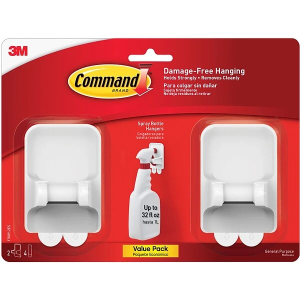 Meet an easy way to organize spray bottles. The Command™ Spray Bottle Hanger is great for neatly storing your spray bottles out of sight, but within reach. Simple to install – no tools required and no damage to your cabinet doors or walls. Using revolutionary Command™ Adhesive, Command™ products hold strongly on a variety of surfaces, including paint, wood, tile and more. Removes cleanly – no holes or sticky residue. Reusing our spray bottle holder is easy; simply apply a new Command™ Refill Strip, and use it again and again. Holds bottles up to 32 fluid ounces (or up to 2.5 pounds).