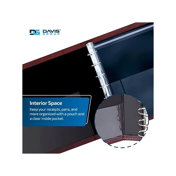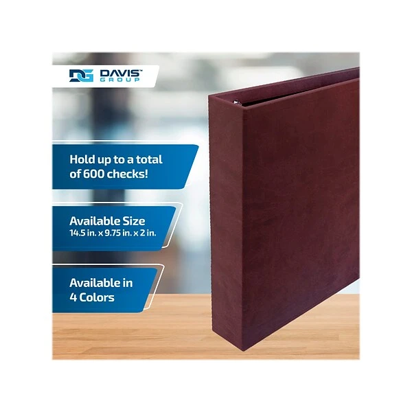 Keep all of your business checks secure inside this Davis Group 3-Up seven-ring binder for checks. This checkbook binder allows you to hold up to 200 sheets, that’s 600 checks! Keep your receipts, pens, and more organized with a pouch and a clear inside pocket. Choose from four elegant cover colors. Each is made from beautiful vinyl and nickel.