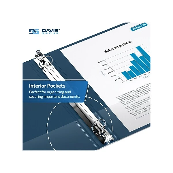 This Davis Group Easyview Premium customizable view binder is perfect for presentations, manuals, projects, reports, and more. The front cover, spine, and back cover feature an ink transfer resistant clear overlay, allowing you to customize each binder and make it your own. Complete with clear interior front and back cover pockets for loose document security. Back-mounted rings allow pages to lie flat. Made of PVC-free polypropylene material for enhanced durability. 100% recycled board with 85% post consumer waste.