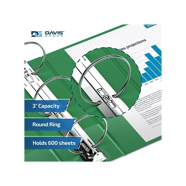 This Davis Group Easyview Premium customizable view binder is great for presentations, manuals, projects, reports, and more. The front cover, spine, and back cover feature an ink transfer resistant clear overlay, allowing you to customize each binder and make it your own. Complete with clear interior front and back cover pockets for loose document security. Back-mounted rings allow pages to lie flat. Made of PVC-free polypropylene material for enhanced durability. 100% recycled board with 85% post-consumer waste.