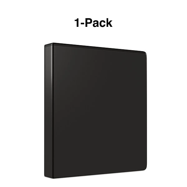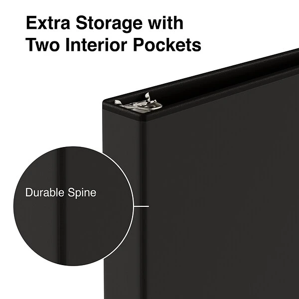 Get plenty of storage space for essential documents with this black view binder. The round rings let pages turn smoothly and are 1 1/2 inches in diameter, so they can comfortably hold up to 275 sheets of paper. This Staples economy view binder has a clear overlay that resists glare, so custom covers and labels are easy to read.