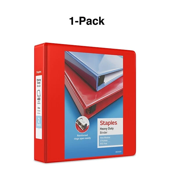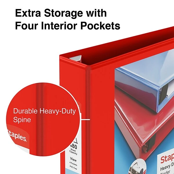 Secure sensitive business documents and keep paperwork organized with this heavy duty three-ring view binder. Ideal for storing important documents, this binder has an archive-safe, PVC-free plastic construction that preserves the integrity of stored documents and easily withstands wear and tear. This Staples heavy duty three-ring view binder boasts a 480-sheet capacity and offers additional storage for loose pages with four stacked inner pockets.
