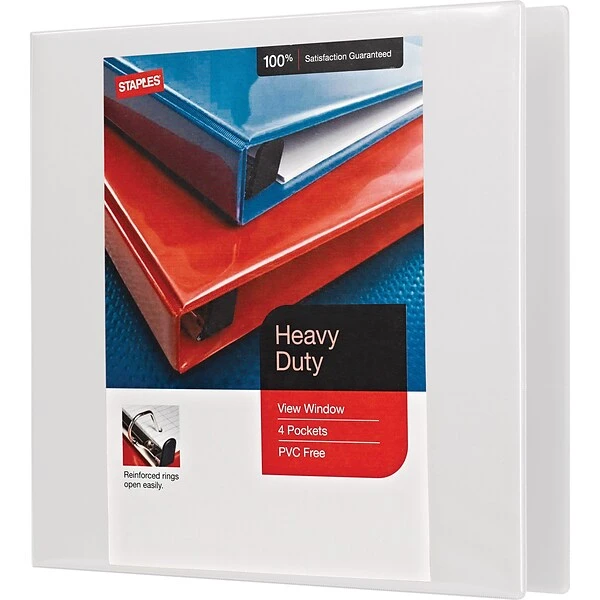 Streamline office storage with these white view binders. The folder has four stacked pockets that are perfect for storing extra papers and documents that can’t be hole punched, while the back-mounted rings make it easy to lay pages flat. The 2-inch slant D rings increase the capacity of this Staples white view binder to 500 sheets, making it perfect for storing large presentations or archiving completed projects.