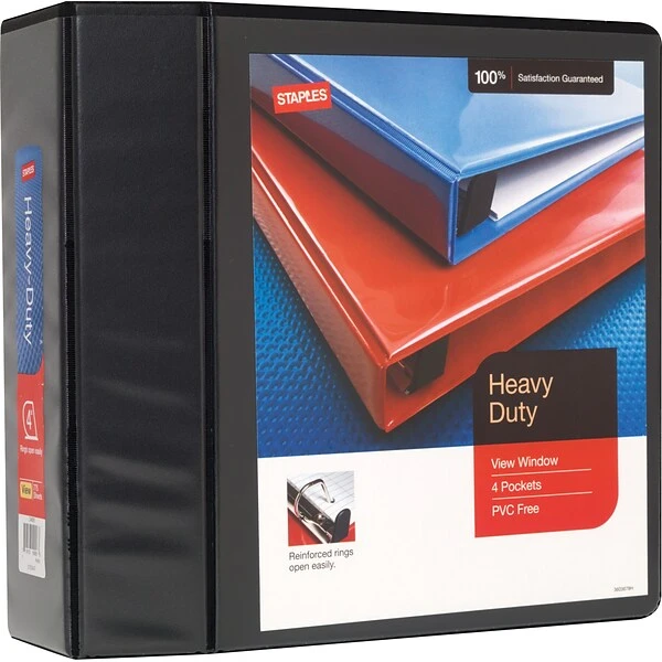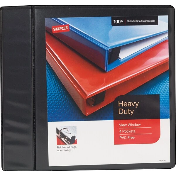 These Staples PVC-free binders hold 775-sheets and are ideal for storage of large documents or multiple small documents. Featuring Slant easy-locking D-rings, these binders holds pages securely in place. With a gap-free ring design, these binders open and close easily and won’t let pages slip out. The Staples 4-inch heavy-duty view binders are made of archival-safe plastics for safe long-term storage.