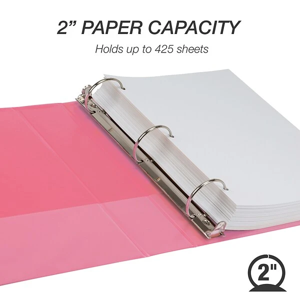 - More Value Adding Features: 2 inch round rings mounted on back lid hold up to 450 sheets, allow pages to lay flat, reduce wear on punched pages and provide a clean looking spine. Extra storage for loose documents or unpunched pages with two clear inside pockets