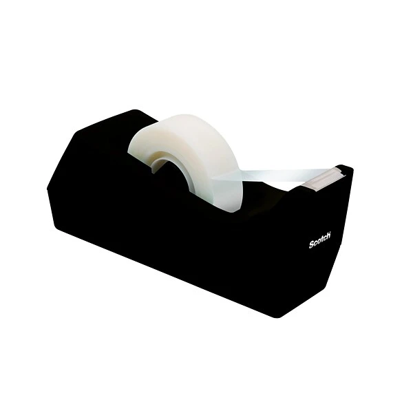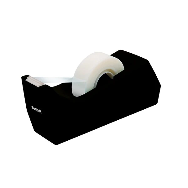 Scotch® classic desktop tape dispenser C 38 is made from 100% recycled plastic. This black, economical tape dispenser allows for one handed dispensing of a wide variety of tapes. It holds standard, 1 in. core tapes and can hold tape up to 3/4 in. wide by 1500 in. long. The weighted base allows for one handed dispensing. This dispenser is an economical, reliable, classic style desktop office tape dispenser and is made in the USA.
