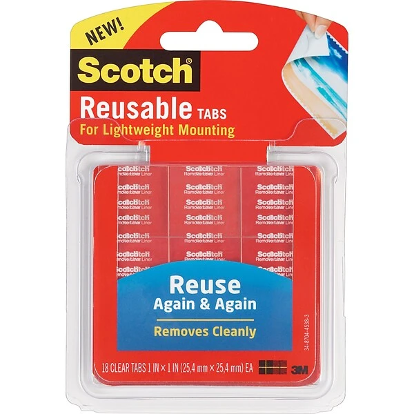Scotch® Restickable tab in clear color has adhesive on both sides for mounting/securing objects and measures 1″ x 1″. Sheet is washable and can withstand weight up to 1 lbs.