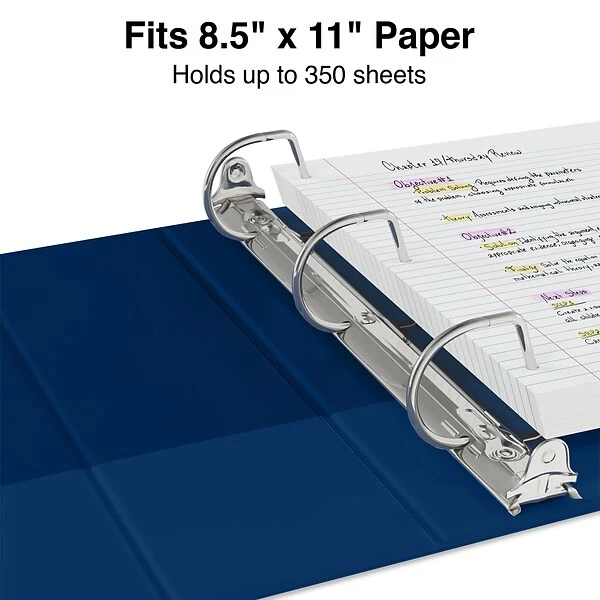 Safely store and access your documents using this Staples standard blue binder. The 1 1/2-inch D-rings allow pages to lie flat and have a 350-sheet capacity to handle large stacks of papers. Two pockets in the interior deliver additional storage options. This Staples standard binder has wider front and back panels to fully cover standard dividers and sheet protectors.