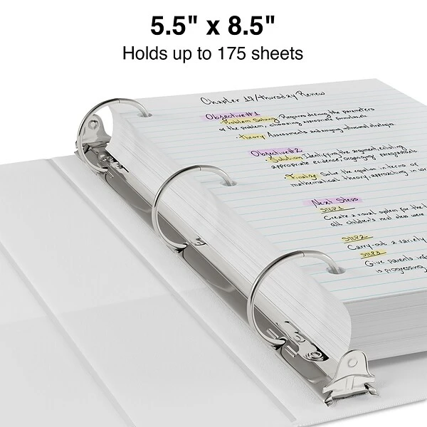 Stay on top of paperwork and assignments with this mini view binder. This binder holds up to 175 pages and offers round rings that resist gapping, so you can turn pages with ease, while the nonstick, archival-safe material prevents toner and ink from being lifted from printed papers. This Staples standard mini view binder includes two inside pockets, providing additional storage and organization options.
