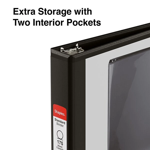 Keep records and printed material safe and easily accessible with this Staples standard view binder. The D-rings contain up to 220 sheets and let the binder lie flat for writing without removing the paper, and the archival-safe covers don’t remove print or toner from pages. The wide cover panels of this Staples standard view binder completely cover documents and page dividers to protect contents for long-term storage.