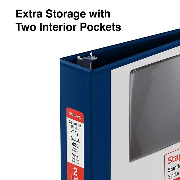 Turn pages smoothly with this Staples standard blue view binder. Pages lie flat thanks to the 2-inch D-rings that are capable of holding up to 500 sheets, while this binder’s covers are wide enough to fully cover letter-size papers and dividers. This Staples standard blue view binder is manufactured with a nonstick material that doesn’t smudge the ink on documents.