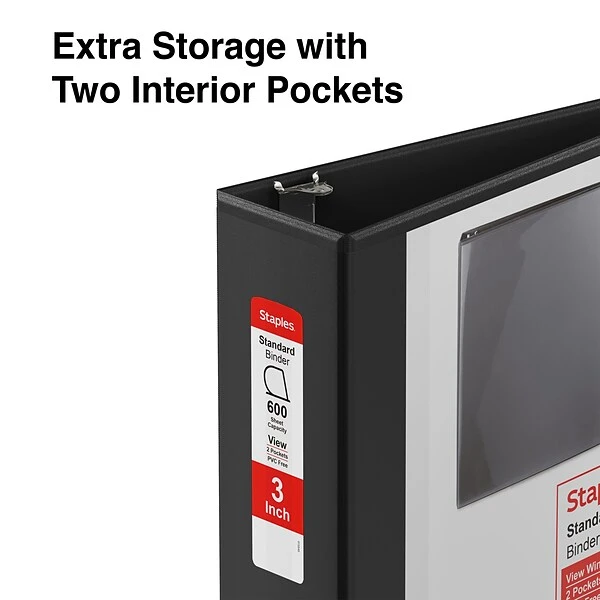 Personalize the cover and spine of this Staples Standard black view binder for a professional look. Two interior pockets offer additional organization options and storage space for unpunched papers, while the PVC-free plastic construction provides durability and reduces negative impact on the environment. This Staples standard black view binder can hold up to 650 sheets of paper thanks to its three 3-inch D-rings.