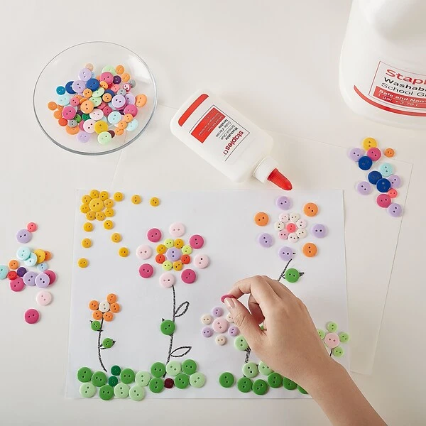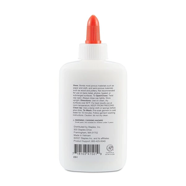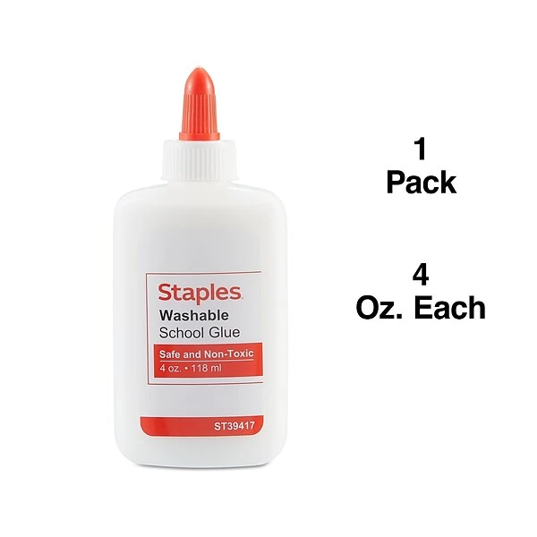 Provide a safe and effective glue with this washable school glue. Made from nontoxic ingredients, this glue firmly sticks to paper, cloth, wood, and pottery, letting budding creatives experiment with various craft supplies. This Staples glue is removable with water, making it easy to clean hands and work surfaces, and the 4-ounce bottle is the ideal size for smaller hands.